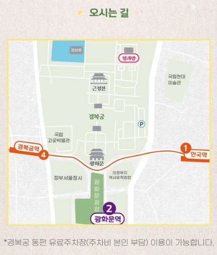 궁 안 깊숙한 곳에 위치해 있어, 체험 시간보다 10분 일찍 도착하는 것이 좋습니다.
