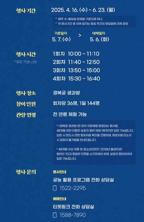 → 국가유산진흥원 홈페이지 및 문자 발송 - 당첨자 예매 기간: 2025년 4월 4일(금) 14:00 ~ 4월 7일(월) 23:59