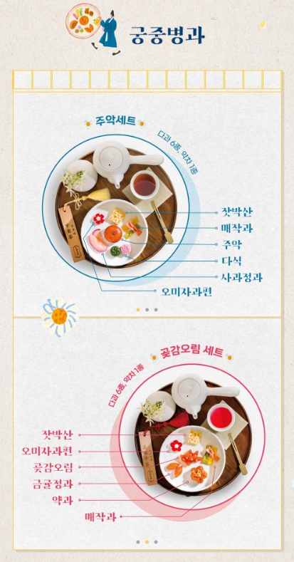 - 궁중 병과 세트 2종 중 1종 선택 / 궁중 병과 1세트 = 다과 6종 + 약차 1종